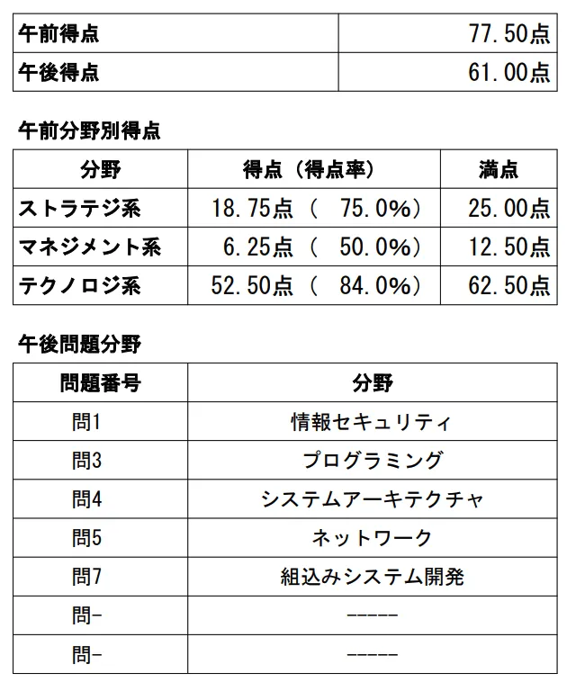 当然、技術系以外の科目もあり、午前では必答です。僕は、そういった分野を半分捨てていました。具体的には、ストラテジ、マネジメントの分野です。点数的には 3 割来ます。