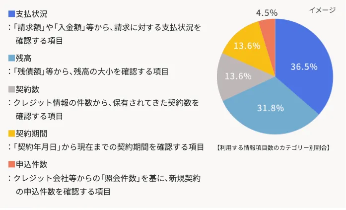 また、以下が指数の算出の項目割合のようです。項目割合からして、支払い状況と残高が肝です。利用金額が大きいほど良いはず。残高は大小どちらが良いか、分かりません。大きなローンを組んでいることは、組めている時点で信用があるため指数にプラスの影響を与えるようにも感じます。