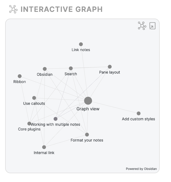 Notion ではページのメンションにてページ間の関係を作ることが出来ますが、Obsidian でも同様にページリンクを貼れます。貼るだけでなく、グラフビューといい、独自の機能ですが、以下のように閲覧することも出来て楽しいです。