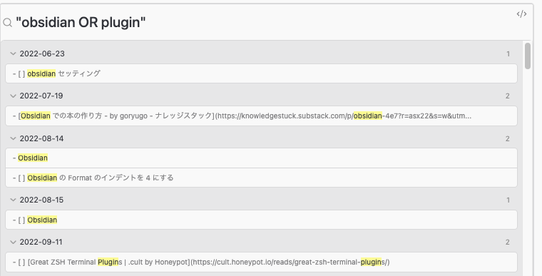 meeting workで AND 検索(両方含まれるページを返す)meeting OR workで OR 検索(どちらかを含むページを返す)meeting -workでmeetingからwordを抜いた検索/\d{4}-\d{2}-\d{2}/のように正規表現で検索- 検索ページの埋め込み